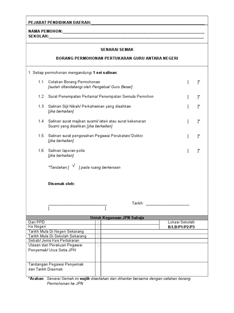 Senarai Semak Pertukaran Guru Eg Tukar Negeri Pdf